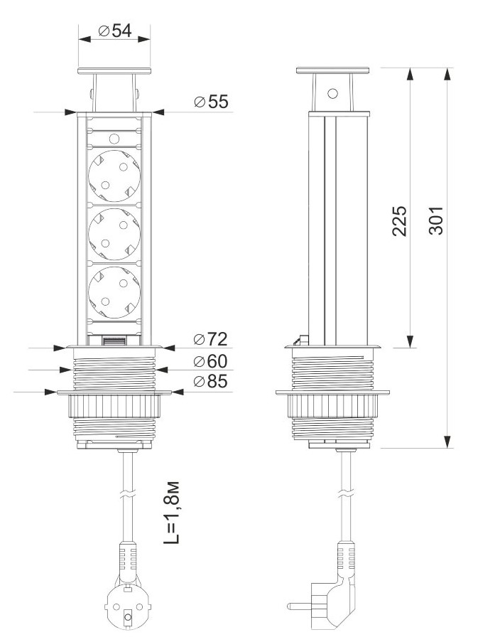 Размеры, d x высота 85 × 301 мм